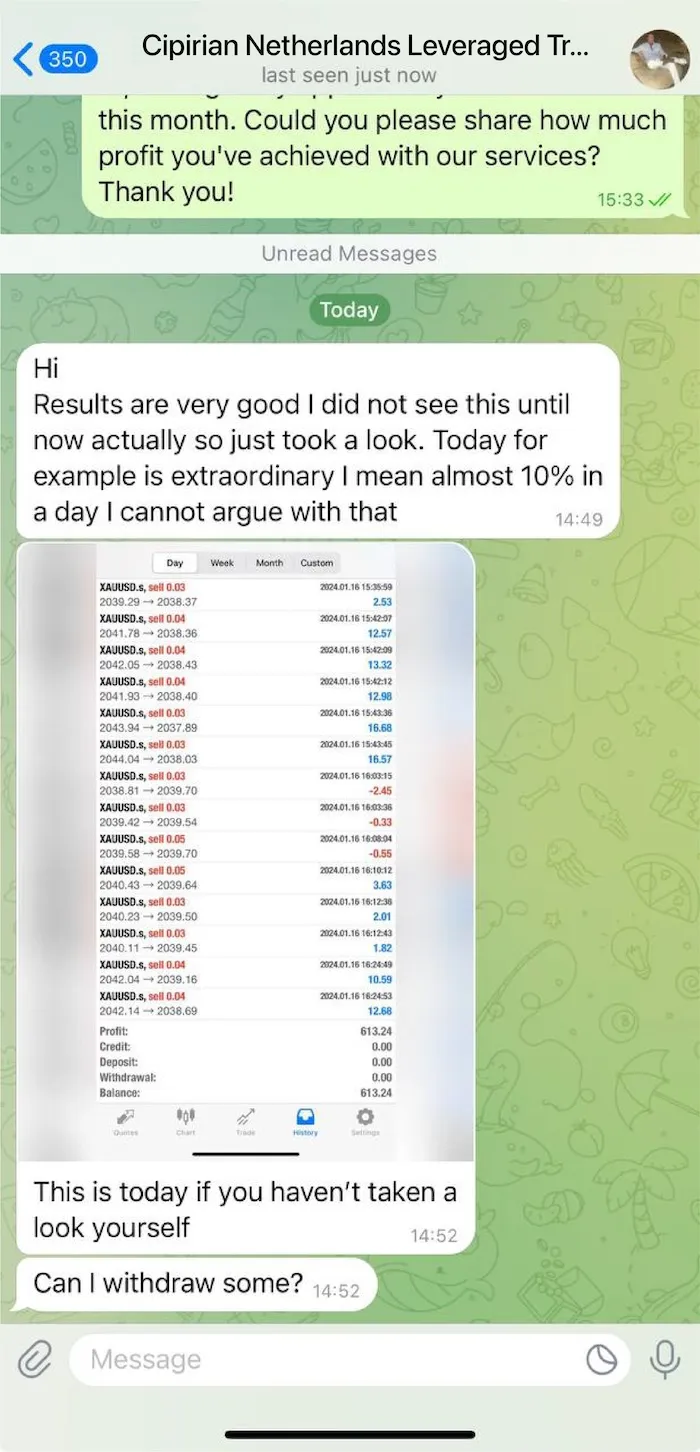 Most trading channels keep you in the dark no community, no real discussions, just faceless messages and cherry-picked screenshots. Our client channel is a space where everyone connects and talks openly about their experiences. You’re part of a network that collaborates and profits together. Members discuss everything because we have nothing to hide.